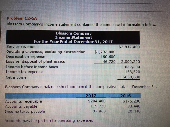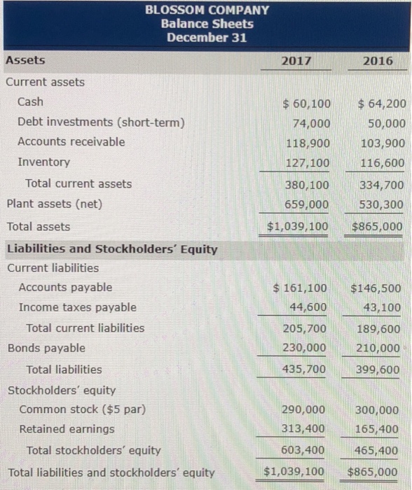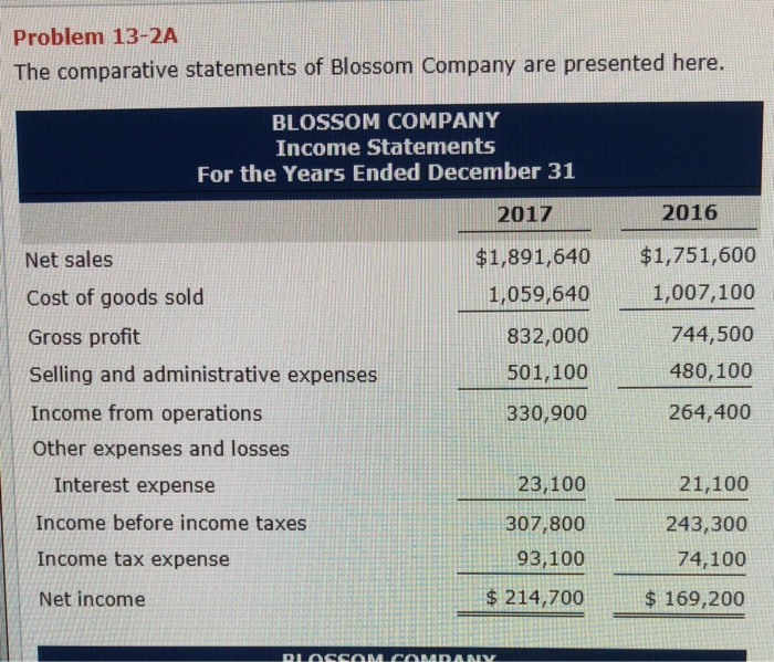 Problem 2-6A Condensed balance sheet and income statement. Blossoms balance sheet contained the following comparative data at December. Cost Of Goods Sold 540000 Selling General And Administrative Expenses 60000 Other Net 40000 Total Costs And Expenses 640000 Income Before.